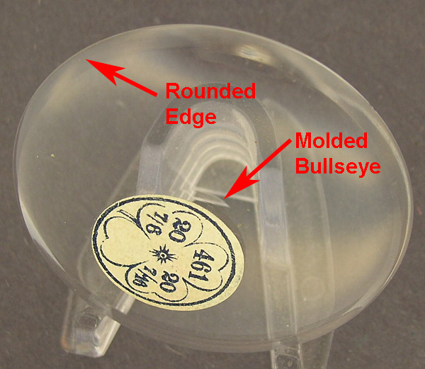 These are low dome bullseye crystals that were made in the early 1900's. The crystals are molded and the bullseye is molded in. They have a bit of a dome to them but nothing like the 'high dome' crystals described above. These do look nice on English watches made in the late 1800's through the 1900's. Please provide size requirements in millimeters or lignes using the conversion chart below. These crystals are $15 each. |