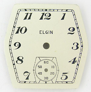 Elgin single-sunk fancy dial. Dial feet at 19.2, 36.0, 54.7. Small hairline at the 29 minute mark. |