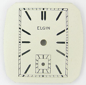 Elgin bold single sunk dial. Dial feet at 19.2, 36.0, 54.7. Includes matching hour and minute hands. Hairlines at the '11'. |